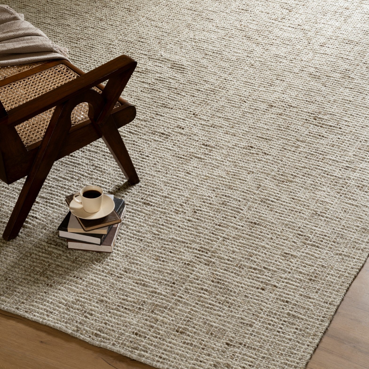 An organic pebble-grid weave blending heathered New Zealand and Mediterranean wools into a plush, tactile texture..